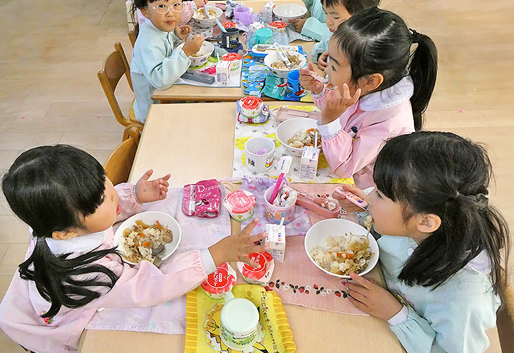 月曜日はパン給食、火曜日はご家庭からの手作りお弁当、水・木曜日はカレーやシチュー、丼物などの給食を提供しています。