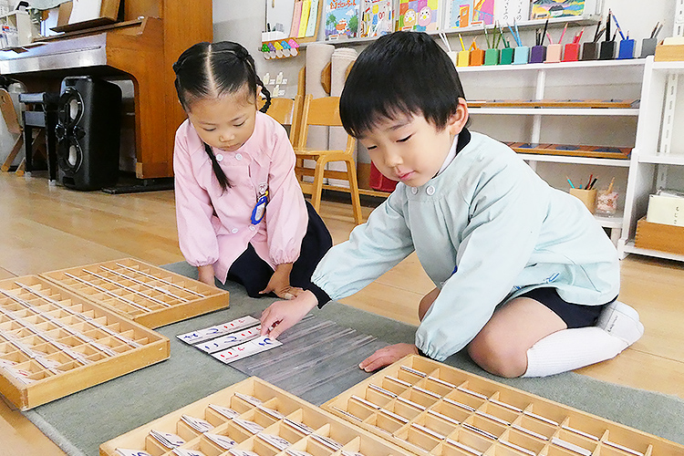 言語教具は、絵合わせから始まり、文字の世界への興味を育てるよう配慮された教具です。