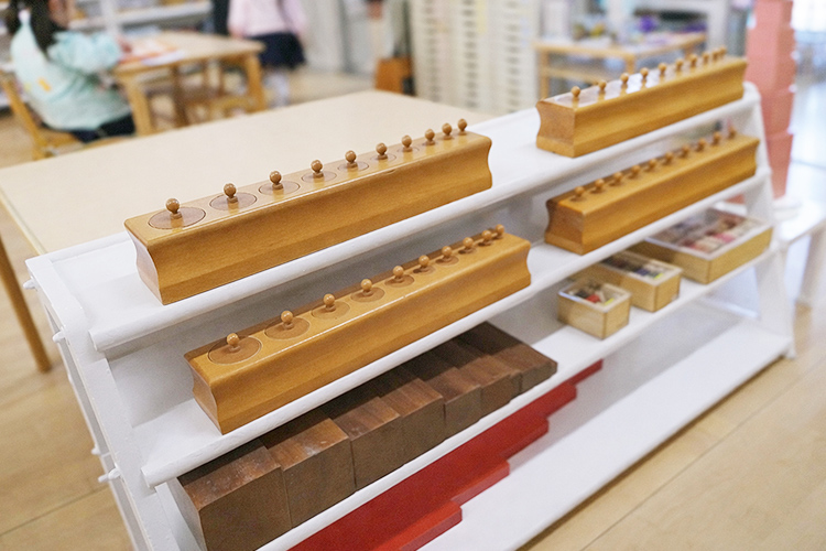 具体的な感覚教具は、触覚・視覚・聴覚・臭覚・味覚の五感を通して、同一性・漸次性を確かめる力、識別や分類の力を養い、生活からの経験、吸収した多くのものを整理し、秩序づける手助けをします。