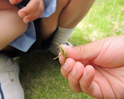 「ばった みつけた!」観察すると、芝生の上にかえします。