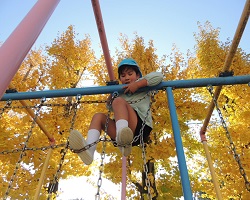 たくましい姿の年長児がのぼり棒の上まであがります。