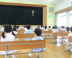 ホールには、縦割りクラス2クラス(4回に分けて)ずつ入り、
