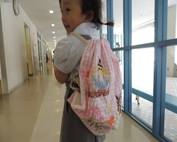 背中に背負って、「こうゆう ばっく なかったから うれしいな」