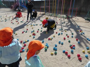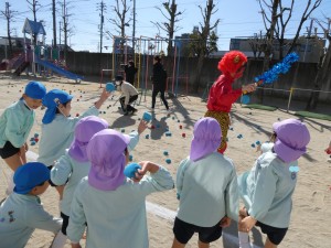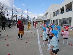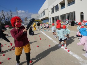 園庭で、豆に見立てた玉を鬼に向かって元気いっぱい投げましたね!