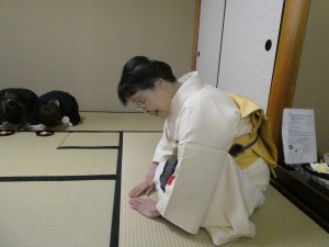 畳の上に姿勢よく座り、丁寧にお辞儀をする姿は