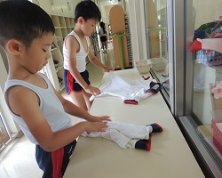 脱いだ体操服を丁寧にたたんでいる年長児