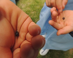 自分が見つけた「だんごむし」をちいさなおともだちにと