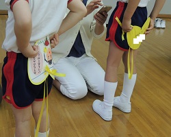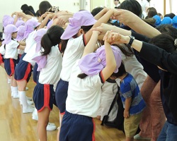 おうちの方とともに、自己紹介・玉いれ・障害物リレー