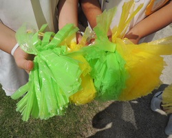 きれいないろの ポンポン ポンポンを手にしているのは