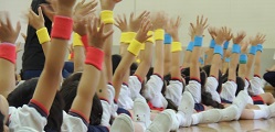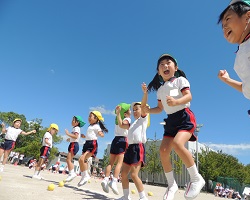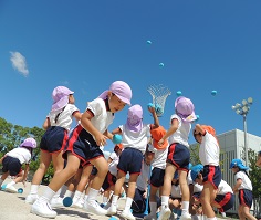 頭上のかご目指して!玉入れジャンプしているのは年中さん
