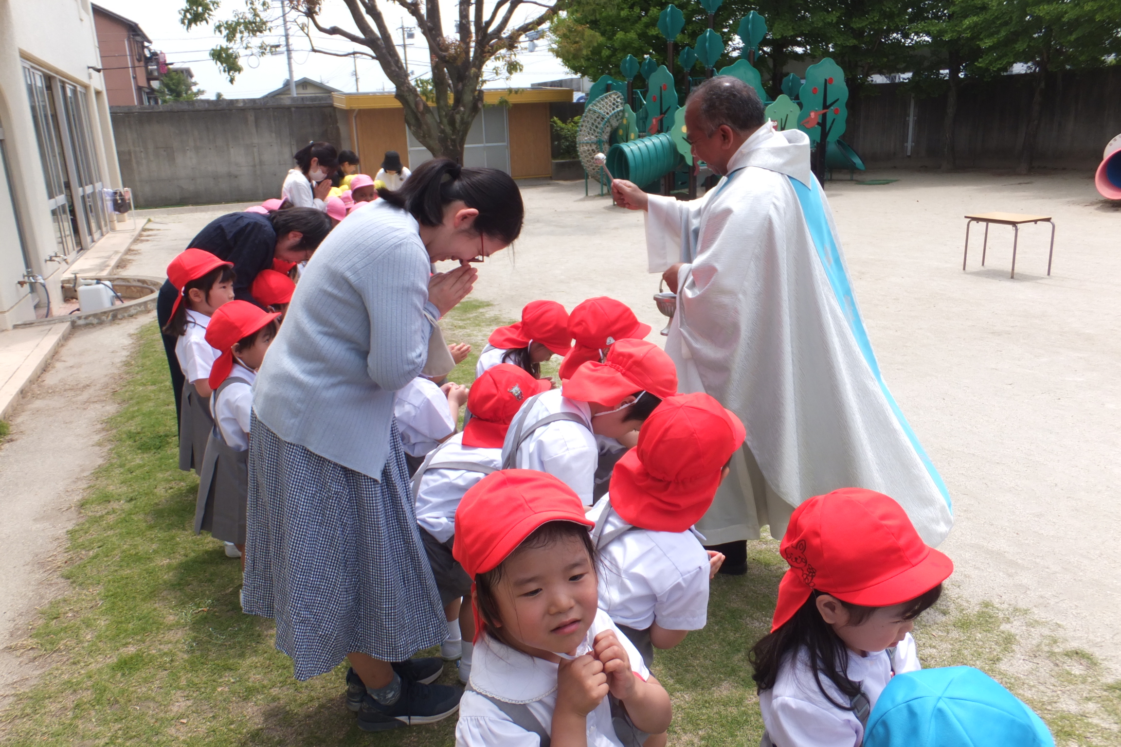 年中・年少・満3歳児も神父様から祝福を受けました。