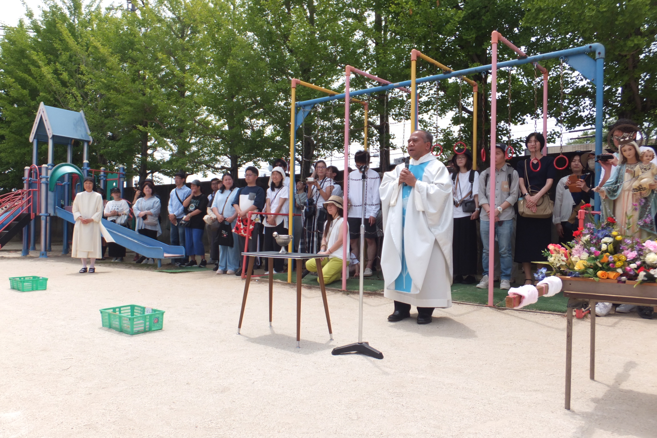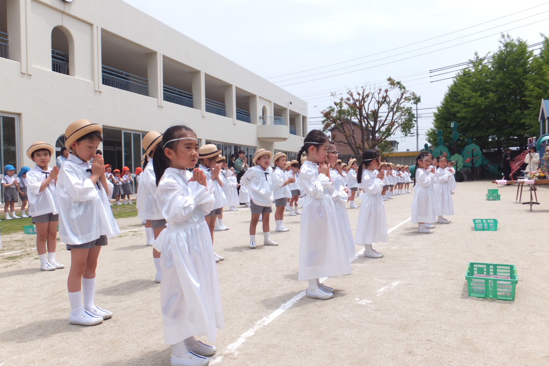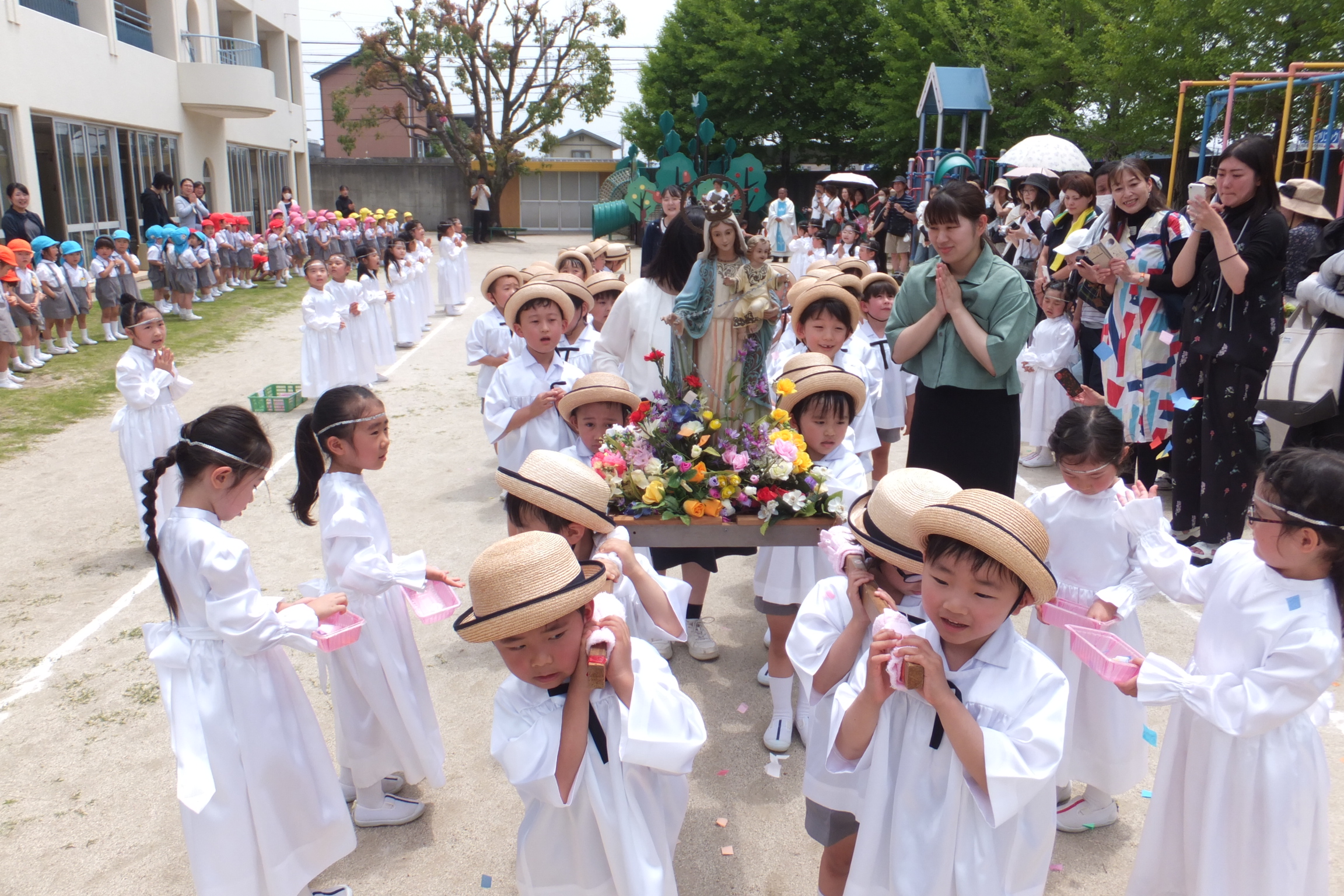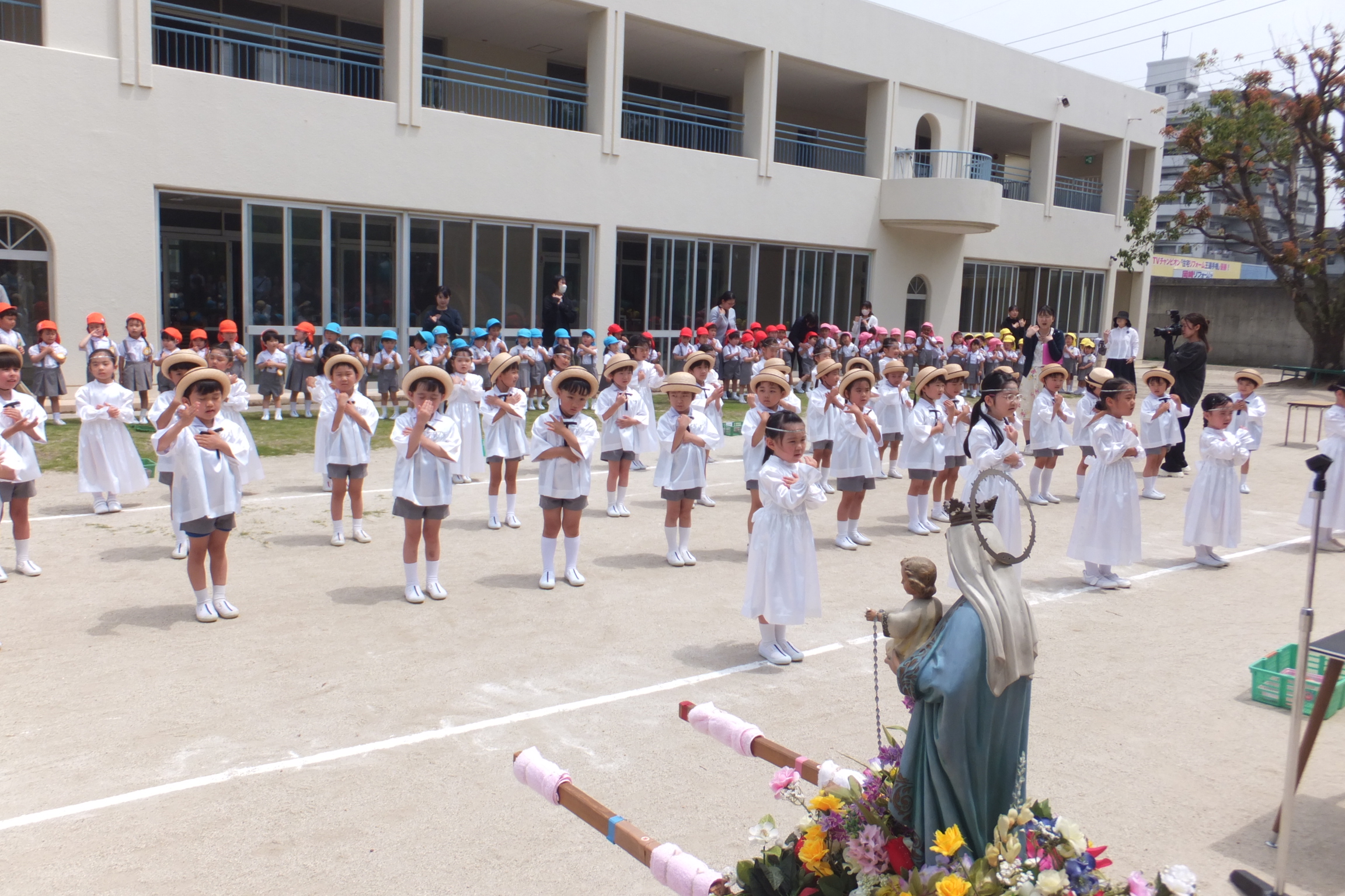 園庭で、全園児そろってマリアさまを讃える