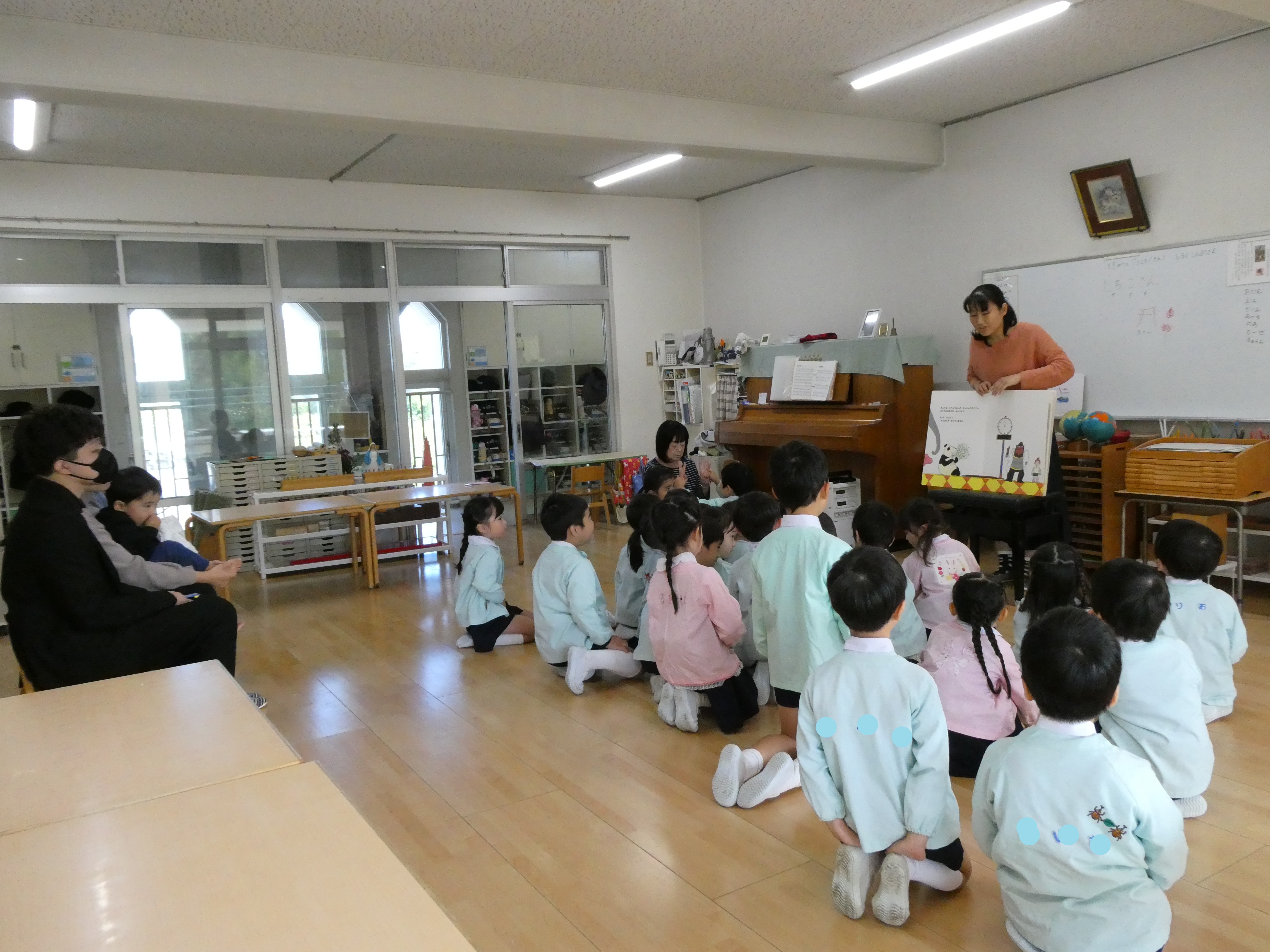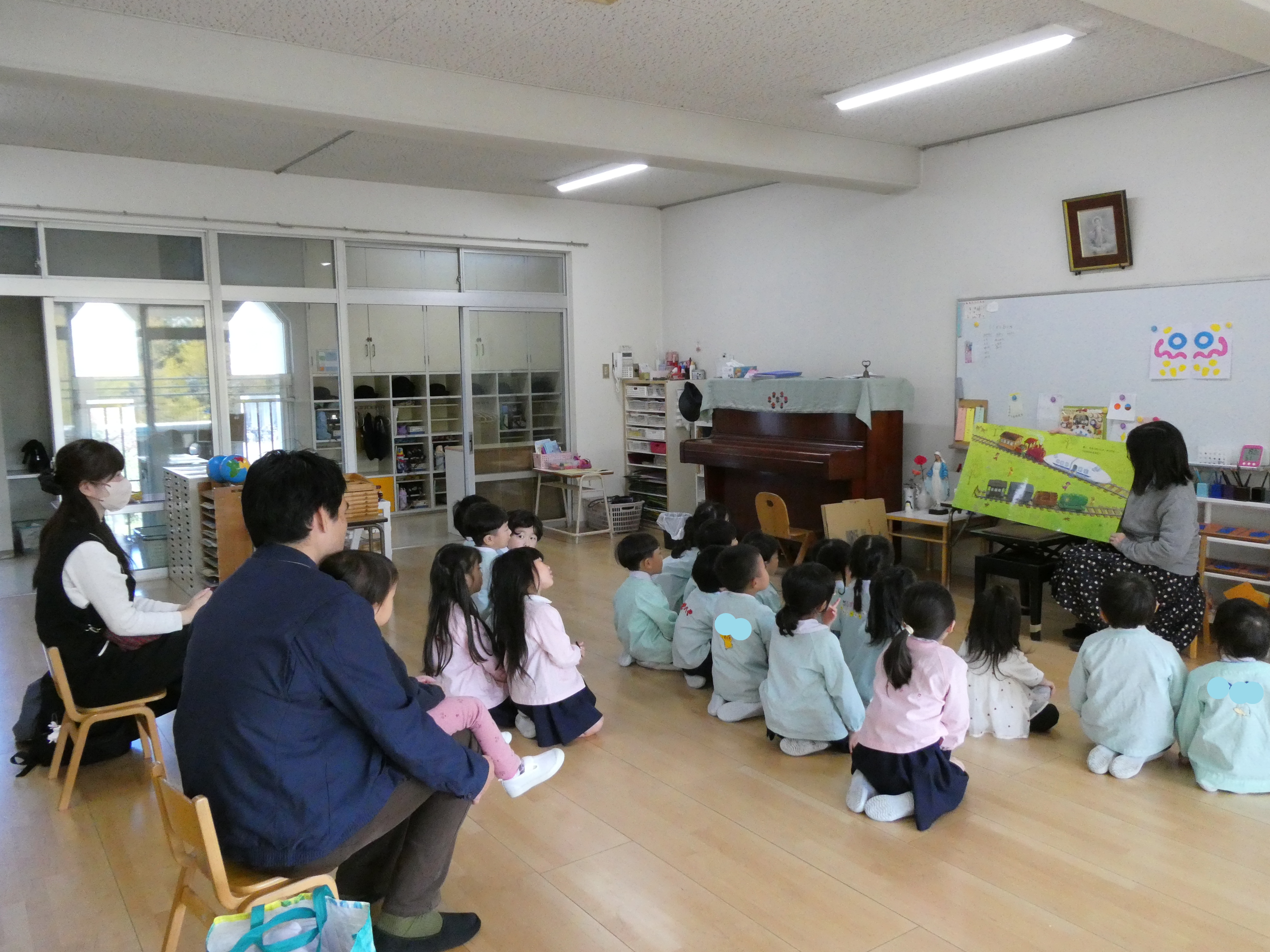 各クラスでは、先生たちが大型絵本を読んでくれたり